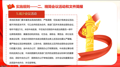 会议伊始,王嘉慧同志带领全体党员重点学习了实施细则中关于“精简会议活动和文件简报”的第五至第十条内容。王嘉慧同志逐条解读,指出要从严控制会议数量、规模和时间,充分运用现代信息技术提高会议质量和效率,切实杜绝形式主义、铺张浪费等现象。她强调,文件简报的制定与报送也应做到内容聚焦、质量过硬,推动机关工作更加规范、务实、高效。