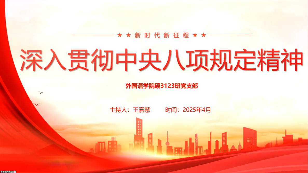 硕3123班党支部开展专题学习活动。会议由支部书记王嘉慧主持,围绕中央八项规定实施细则第二部分内容展开深入学习与讨论,并通过典型案例引导党员坚定理想信念,锤炼党性修养。支部全体党员准时参会,认真学习并积极参与讨论。